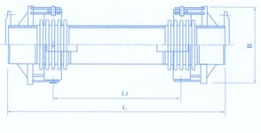 该膨胀节由两个十字销轴,用长的中间拉板组合而成,它能吸收任意平面内的横向位移,它们的铰链与十字销轴具有承受内压推力能力